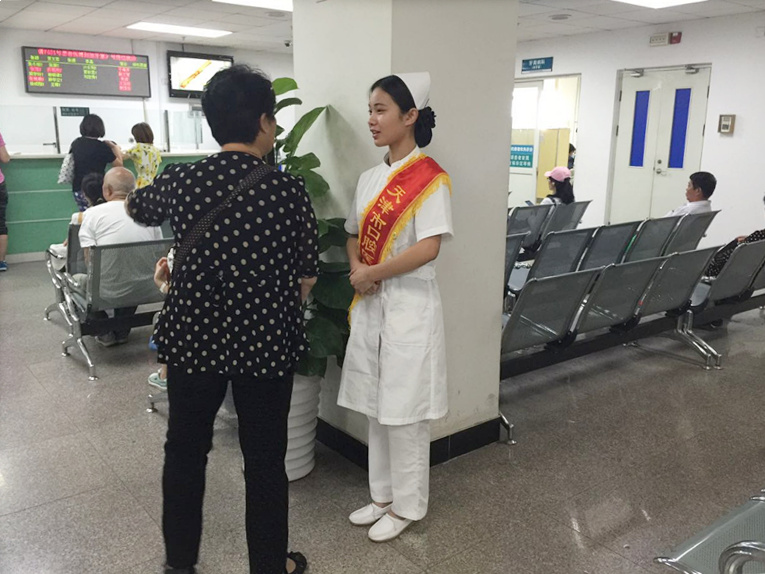 在医院的统一安排下,志愿者提供了包括导诊导医、预约诊疗、健康教育、检查引导、代为取药、告知就医流程、取送检验报告单等服务,患者有疑问时志愿者给予解答,患者排队时志愿者给予疏导,患者不理解时志愿者进行耐心地解释,患者行动不方便时志愿者主动上前搀扶……他们积极、主动、热情的服务受到了广大医护人员和患者的广泛好评。身着护士服,披着志愿者绶带的她们,变成医院周末门诊的一道风景线。
